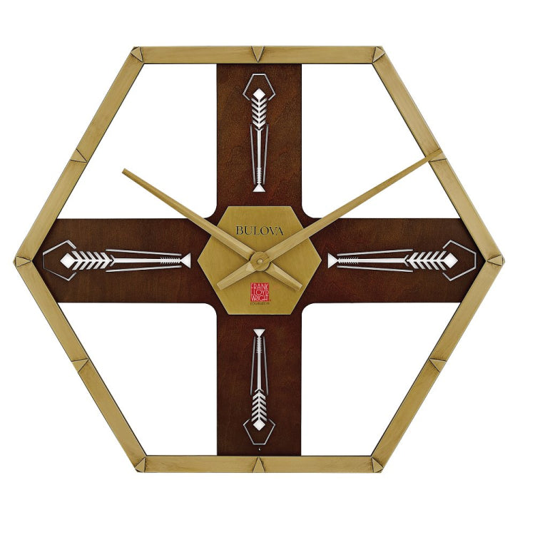 Inspired by elements of the Historic Frank Lloyd Wright 1923 design of the Imperial Hotel in Japan and in Honor of the 100th anniversary of his design. The gold finish case shape, triangle raised hour markers and laser cut “peacock feather” design are all Wright architectural elements used in the building’s design. As an homage to Wright’s forward thinking, this unique clocks inside walnut finished wooden frame is back lit automatically in low light to enhance Wright’s beautiful Peacock feather design. The LEDs are battery powered and have adjustable settings that allow for a low light to 6-hour time or on in low light off at full light. A unique design feature not offered anywhere else. The Accurate quartz movement uses 1 AA battery, and the LEDs are powered by 4 D Cell batteries ( not included)
