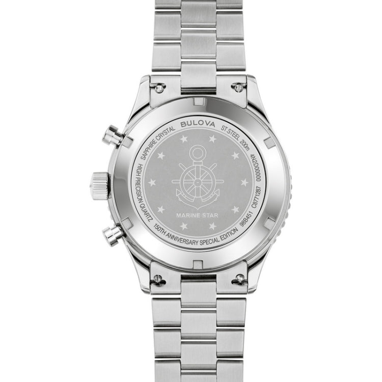 Inspired by the coveted Bulova’s Marine Star circa 1970s, this Special Edition Marine Star 6-hand chronograph celebrates one of Bulova’s most iconic collections for its 150th Anniversary. The silver-tone stainless steel case has a design that balances form and function with a striking ratcheting timing bezel, a commemorative case back featuring an original anchor design, and a profile-cut link bracelet with a push-button foldover closure. The black dial showcases the vintage Marine Star logo, silver-tone hands, and white numerals with super luminous fill, a date display, and sub-dials, including registers allowing timing to 1/20 of a second and finished with a double domed sapphire crystal. This collector’s watch is powered by our proprietary Precisionist movement, resonating at a frequency of 262khz for unparalleled accuracy, and boasts 200m water resistance with a screw-down crown. Delivered in premium packaging complete with a storybook,