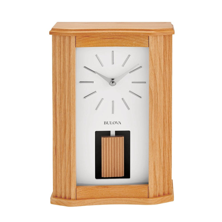 Mid Century modern Chiming table clock has a clear solid Alder hardwood case and clear finish that enhances the natural wood grain. The angled ribbed side columns are accented by a swinging matching wooden pendulum. Silver finished raised hour markers contrast with the bright white dial offering a clean contemporary look. The Bulova Harmonic Westminster chime plays on the hour and has a separate hour strike, volume control and a selectable night silence option. The accurate quartz movement uses 3 AA batteries (not included)